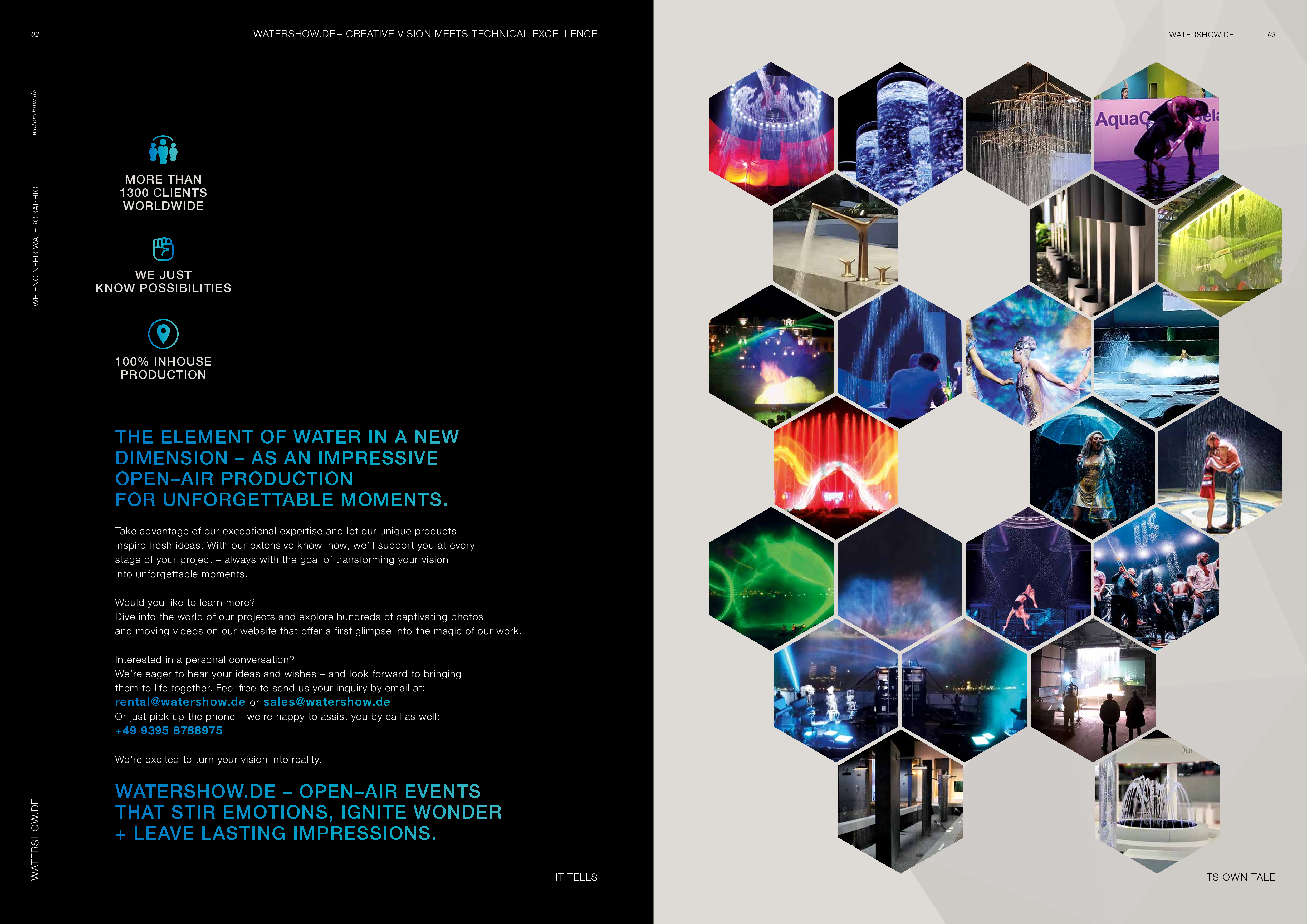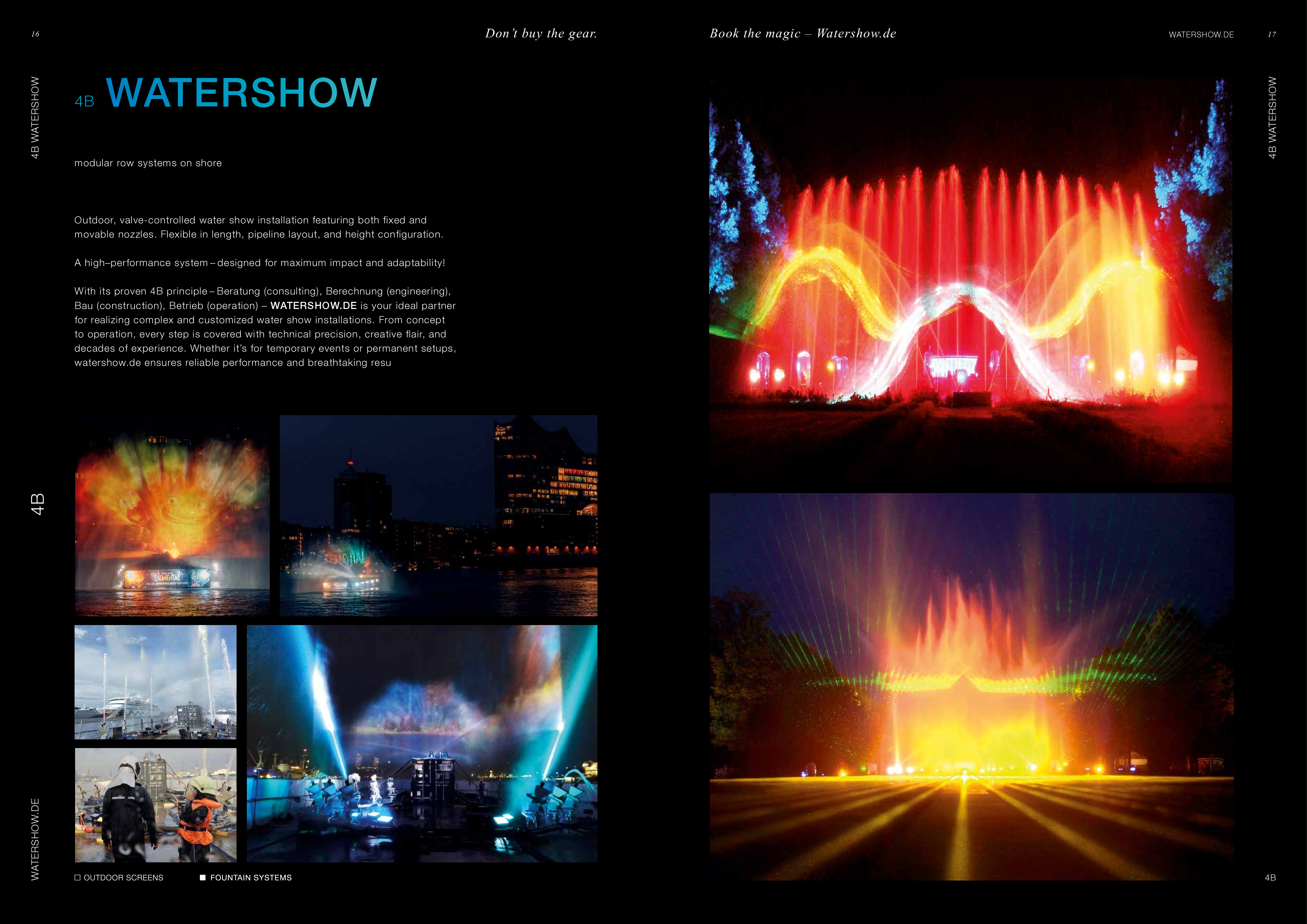 Watershow.de GmbH verwandelt Wasser in unvergessliche Erlebnisse. Von funkelnden Fontänen und eleganten Wasserwänden bis hin zu hochmodernen Wasserscreens, die Logos und Bilder mit fallenden Tropfen schreiben. Jede Show ist ein einzigartiges Highlight. Mit individuellen Lösungen, perfekter Technik und beeindruckender visueller Wirkung lässt Watershow.de Marken erstrahlen und Events unvergesslich werden.